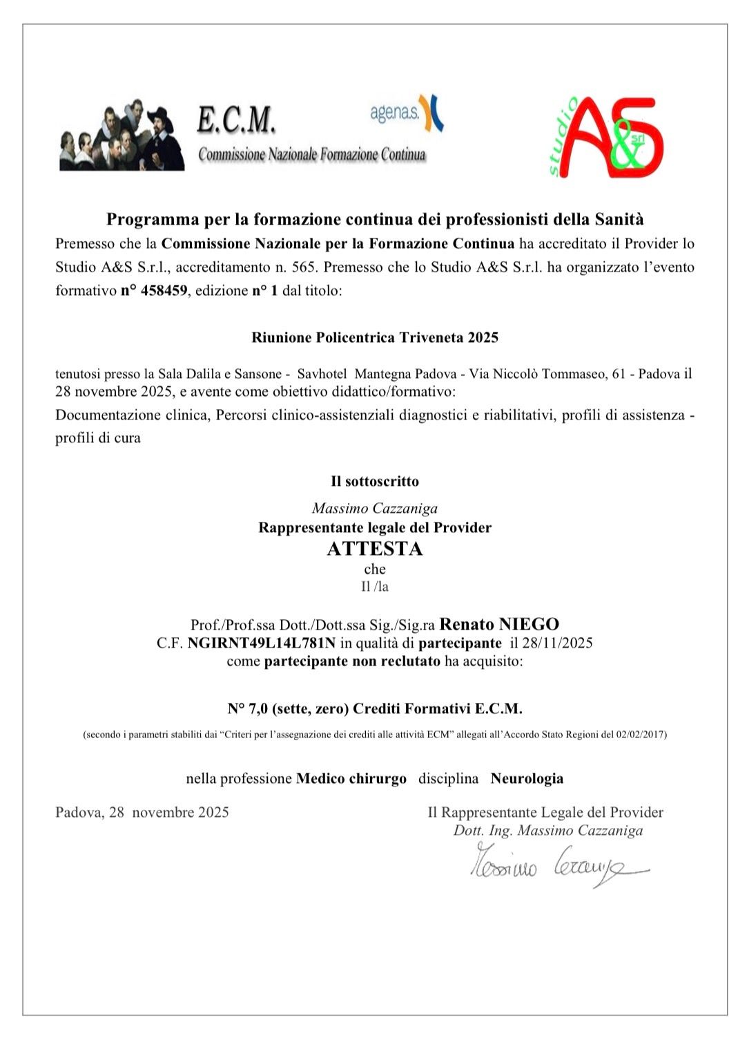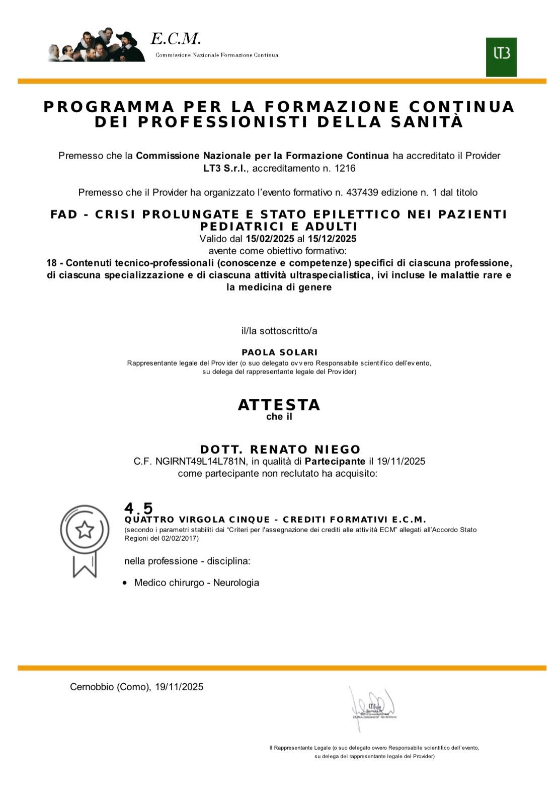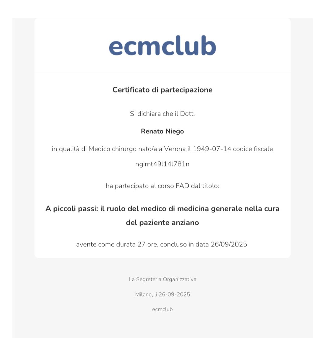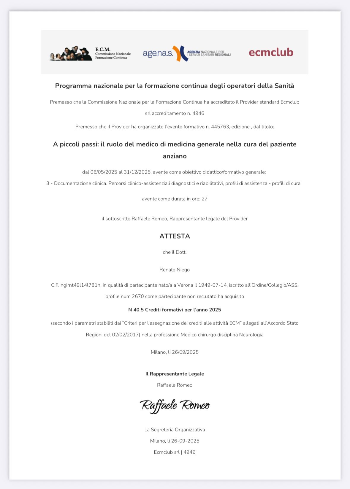 È stato un piacere esser ascoltati, nuovamente, dal dottor Niego. Garbato, gentile, empatico, capace di proporre una soluzione farmacologica che mai era stata presa in considerazione, dai colleghi. Puntuale e attento alle parole del paziente, capace di ascoltare e consigliare, con atteggiamento mai cattedratico, sempre gentile, ironico e pacato. Inoltre, è costantemente assai aggiornato per quanto attiene alle cure farmacologiche ed agli integratori che possano coadiuvare le molecole altre, nel percorso di cura, da lui scelte dopo aver attentamente visionato gli esami ematici. Lo ringrazio per la disponibilità, l'approccio e la dedizione, davvero rare.